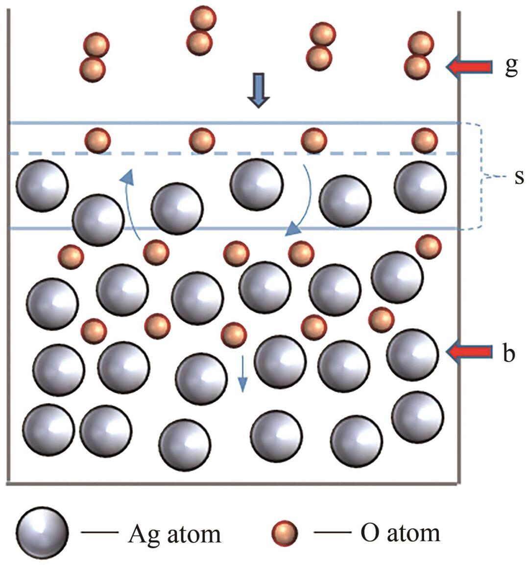 根據(jù)圖1,首先O2分子從氣相(g)擴散至表面相(s);其次在Ag的催化下解離為O原子,并發(fā)生化學吸附;最后,O原子從表面相(s)擴散至本體相(b)。整個過程可以表示為: