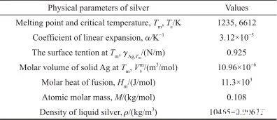 式(7)表示在整個溫度范圍內(nèi),液態(tài)Ag的表面張力與溫度的關系,相關參數(shù)的取值列于表1[21-26]。