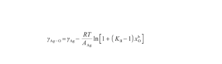 由式(12)和(13)可以看出,Butler方程計算較為復雜??紤]液態(tài)氧的表面張力很小[14],可以認為γO≈0。另外,由于Ag-O系中O原子數(shù)遠小于Ag原子數(shù)[29],可以將Ag-O溶體視為理想溶體。此時,GE,b=G=G=0。根據(jù)文獻[18],當式(12)所示的Butler方程用于描述理想溶液時,通過假設系統(tǒng)內(nèi)兩組分具有相等的摩爾表面積,可以得到改進的Butler方程。這個改進的Bulter方程能夠推導出Gibbs吸附方程和Langmuir方程,被認為是表面張力和溶液吸附的根本方程。因此,令AAg=AO,將式(12)變換為: