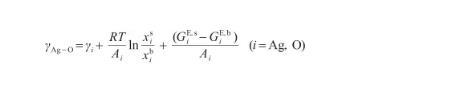 式中,γAg-O表示Ag-O系的表面張力(N/m),γi表示純組分i的表面張力(N/m),R為氣體常數(shù)[J/(mol·K)],x和x分別表示組分i在表面相和本體相中的摩爾分數(shù)(mol/mol),Ai為組分i的摩爾表面積(m2/mol),G和G分別表示表面相和本體相中組分i的偏摩爾過剩自由能(J/mol),并且G=λG,其中λ為表面相和本體相的原子配位數(shù)之比[27]。G可由摩爾過剩自由能GE,b表示,其關系式為:
