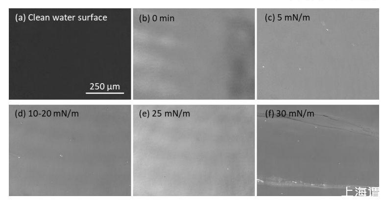圖3、空氣-水界面處的FhuA膜BAM(布呂斯特角顯微鏡)圖。(a)在MPD緩沖液中擴散FhuA WT之前和(b)之后的Langmuir槽氣-水界面BAM圖像;和(c-f)在不同表面壓力下的屏障壓縮。涂敷后立即在空氣-水界面上吸附一層致密均勻的FhuA WT膜。FhuA WT膜可以被壓縮到高達25 mN/m的表面壓力,而不會表現出不均勻性。在表面壓力為30 mN/m時,在FhuA WT薄膜中可以看到垂直于壓縮方向的細長裂紋。