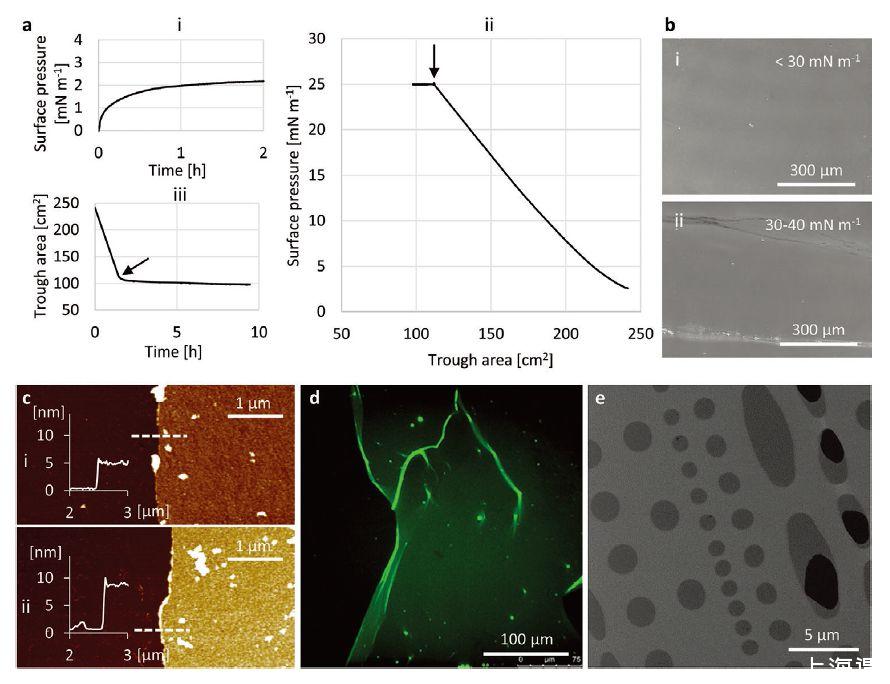 圖2、a)在空氣-水界面處的FhuA膜并轉移到基底上。(i)吸附,(ii)壓縮,和(iii)在膜制造期間從0.32nmol FhuA WT涂布在磷酸鹽緩沖液頂部測量的谷面積-時間曲線在(ii)和(iii)中,戊二醛的注射用箭頭標記。B)相應的BAM成像顯示(i)在高達30 mN/m的表面壓力下均質的FhuA膜-1.(ii)表面壓力超逾30mN/m)(i)一個或(ii)兩個FhuA膜片的AFM圖像,所述膜片層疊在硅基底的頂部上(左半部分用注射器尖端刮去)。高度分布屬于圖像中的虛線,并且指示(i)5和(ii)9 nm的膜厚度。d)單個FhuAΔCVF的共聚焦熒光顯微鏡圖像,用熒光標記物標記的硅襯底上的薄膜片e)獨立地覆蓋TEM網格(淺灰色)的結構化碳膜中的孔(深灰色)的FhuA WT膜的HIM圖像。黑色區域顯示膜中的缺陷。