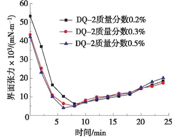 測(cè)定低界面張力表面活性劑DQ-2體系的質(zhì)量分?jǐn)?shù)分別為0.2%,0.3%,0.5%的油水界面張力,不同濃度目標(biāo)體系的油水界面張力隨時(shí)間變化曲線(xiàn)見(jiàn)圖1。