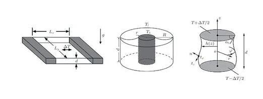 液層模型是源自于空間晶體生長實(shí)驗(yàn)探索的簡化模型,是研究微重力條件下界面張力梯度驅(qū)動(dòng)對流基本流動(dòng)規(guī)律的經(jīng)典模型。液層模型主要包括矩形液層(rectangular pool)、環(huán)形液層(annular pool)和液橋(liquid bridge)(圖1)等。相對而言,液橋是一類特殊的液層模型。液橋中界面張力梯度驅(qū)動(dòng)對流的流動(dòng)穩(wěn)定性研究成果極為豐富,相關(guān)系統(tǒng)的完整臨界轉(zhuǎn)捩描述詳見綜述(Hu et al.2008)。除了極薄液層的情況,在絕大多數(shù)界面張力梯度驅(qū)動(dòng)對流的地面實(shí)驗(yàn)研究中,界面張力效應(yīng)和重力效應(yīng)間存在較強(qiáng)的耦合作用。