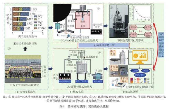 首先,通過原位界面張力測定儀開展的實(shí)驗(yàn)揭示了不同溫壓條件下CO2與地層水系統(tǒng)間的界面張力(IFT)變化規(guī)律。研究發(fā)現(xiàn),儲(chǔ)層壓力的增加會(huì)導(dǎo)致IFT顯著降低,而溫度升高時(shí),IFT會(huì)略有上升。此外,礦化度的增加會(huì)導(dǎo)致IFT增高,特別是在高溫、高礦化度的環(huán)境中。不同的陽離子溶液類型對CO2與鹽溶液之間的IFT也有顯著影響,表現(xiàn)出隨陽離子價(jià)態(tài)的升高而增大的趨勢。