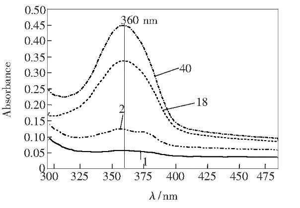 LB膜是在芬蘭生產的KSV2000單槽制膜系統上制備而成的,制膜的亞相為20℃二次蒸餾去離子水。將化合物以氯仿為溶劑配置成1.023×10-4mol/L的溶液,用微量注射器鋪展到亞相表面上。壓膜速度為5 mm/min,在15 mN/m恒定表面壓下采用水平附著法制備X型LB膜,基板為經疏水性處理的直徑為15 mm的石英玻璃。吸收譜及穩態熒光譜的測量分別在日立U-3310型紫外-可見光譜儀和英國Edinburgh Instruments(EI)公司生產的FLS920型熒光光譜儀上完成,熒光光譜的激發光源為450 W氙燈。