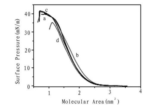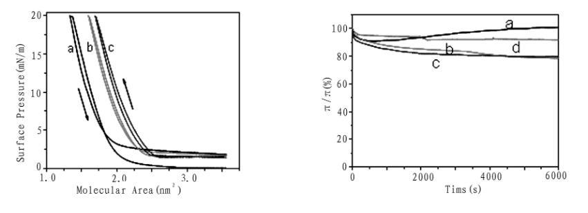 圖3化合物1的壓縮/擴張循環(huán)等溫線(左圖,a,b,c分別為1,2,3次)和不同亞相上的膜穩(wěn)曲線(右圖,a純水,b乙二酸,c丙二酸,d丁二酸)