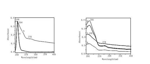 圖4化合物1氯仿溶液(a)和LB膜(30層)的紫外光譜(b)(左圖),在不同亞相(a)純水,(b)乙二酸,(c)丙二酸,(d)丁二酸時轉移30層膜的紫外光譜(右圖)