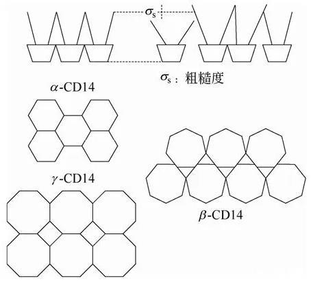 為了考察環(huán)糊精種類對所制備LB膜結(jié)構(gòu)的影響,Schalchli等用X-Ray反射技術(shù)對3種兩親性環(huán)糊精(α-、β-、γ-)在硅片上形成的LB單分子膜結(jié)構(gòu)進(jìn)行了研究。結(jié)果顯示,所有兩親性環(huán)糊精都在基底上形成了單分子層,但兩親性α-和γ-環(huán)糊精LB膜的結(jié)構(gòu)相似,而β-環(huán)糊精LB膜的結(jié)構(gòu)與前兩者有很大的不同。并且兩親性β-環(huán)糊精LB膜的粗糙度也遠(yuǎn)遠(yuǎn)大于兩親性α-和γ-環(huán)糊精。以上不同的原因緣于β-環(huán)糊精的七邊形環(huán)不同于α-,γ-環(huán)糊精的六或八邊形環(huán)是對稱結(jié)構(gòu),從而不能像α-,γ-環(huán)糊精那樣在基底上形成有序的結(jié)構(gòu),如圖1所示。類似地,Alexandre等用掃描力顯微鏡(scanning force microscopy)考察了兩親性α-,β-,γ-全疊氮基環(huán)糊精在云母片上的LB膜的結(jié)構(gòu)。無論在納米尺度還是在微米尺度下觀察,β-全疊氮基環(huán)糊精勻呈現(xiàn)出不同的形貌。