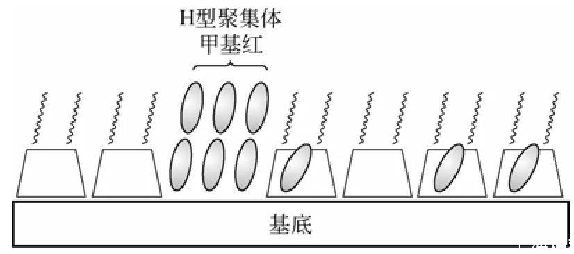 兩親性環(huán)糊精不僅能夠單獨組裝成LB膜,也能夠和其他有機分子共同組裝成雜化LB膜。Matsumoto課題組在兩親性環(huán)糊精和偶氮苯LB雜化膜方面做了大量的工作。因為偶氮苯化合物能夠在光照條件下發(fā)生可逆的順反光異構(gòu)反應(yīng),若將偶氮苯在固體基底上進(jìn)行組裝將對光儲存、光轉(zhuǎn)換器件的發(fā)展具有十分重要的意義。但是由于在單純LB膜中,偶氮苯分子周圍自由體積很小,限制了順反光異構(gòu)反應(yīng)的發(fā)生,而利用兩親性環(huán)糊精和偶氮苯雜化組裝成LB膜以解決這個問題。研究表明部分偶氮苯被包結(jié)在環(huán)糊精的空腔中,空腔為水溶性偶氮苯發(fā)生可逆的光異構(gòu)化反應(yīng)提供了良好的場所。此外,環(huán)糊精疏水鏈段也能夠成為容納客體分子的場所,而且在膜中并非所有的環(huán)糊精分子都會包結(jié)偶氮苯分子,剩余的未包結(jié)環(huán)糊精為進(jìn)一步功能化提供了基礎(chǔ)。但是在該雜化膜中會有部分偶氮苯分子形成的聚集體(圖2),所以進(jìn)一步增加雜化分子的包結(jié)率和分散性是這一類雜化膜的研究方向。