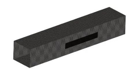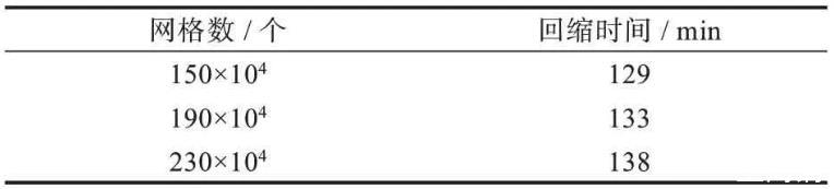 為了避免系統(tǒng)回流的影響,建立一個長×寬×高為50 mm×10 mm×10 mm的流場模型,采用結構化網(wǎng)格,如圖2所示。通過fluent的Eulerian模型、層流模型、Carreau黏度模型、壓力求解器,對PS/POE液液兩相流進行仿真分析。由于實驗時間較長,采用瞬態(tài)求解法,忽略重力、浮力、密度差、加熱不均帶來的影響。入口設置為速度邊界條件,出口邊界為壓力出口,流場上下前后4個面為周期邊界條件。為了確保仿真過程的準確性和經(jīng)濟性,以及獲得兩相流真實的分布情況,首先對網(wǎng)格無關性進行研究。考慮3種數(shù)量(150×104、190×104、230×104個)的網(wǎng)格進行研究。當網(wǎng)格數(shù)量太少時,無法細致描述液滴表面處的形態(tài)(橢球型)。通過數(shù)值模擬,分析了液滴回縮時間t。從表2中可以看出,網(wǎng)格數(shù)量對于計算結果的影響很小,同時考慮到數(shù)值模擬計算的時間和經(jīng)濟性,采用190×104個網(wǎng)格。收斂時間的判斷依據(jù)殘差圖以及液滴形態(tài)兩個標準,計算每一步的殘差值設定為10-3,同時設置主視、俯視、左視3個監(jiān)測面(均位于球心處)用來觀察液滴形態(tài)。形態(tài)為球形時,計算收斂。