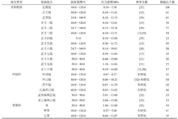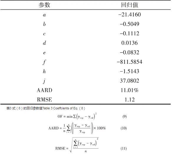 2.4.2實驗數(shù)據(jù)回歸及模型參數(shù)的求取本研究系統(tǒng)收集了文獻數(shù)據(jù),并將研究測定的實驗數(shù)據(jù),共計932個數(shù)據(jù)用于回歸,回歸所用數(shù)據(jù)見表2。回歸參數(shù)由最小二乘法得到,其目標函數(shù)如式(9)所示。采用平均相對偏差(AARD)和均方根誤差(RMSE)表示計算效果,如式(10)、式(11)所示。回歸結(jié)果見表3。