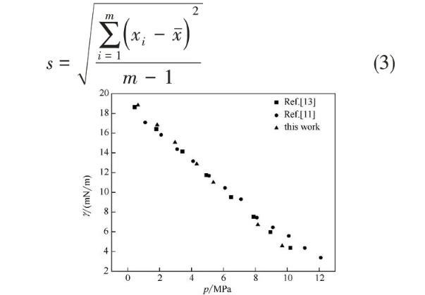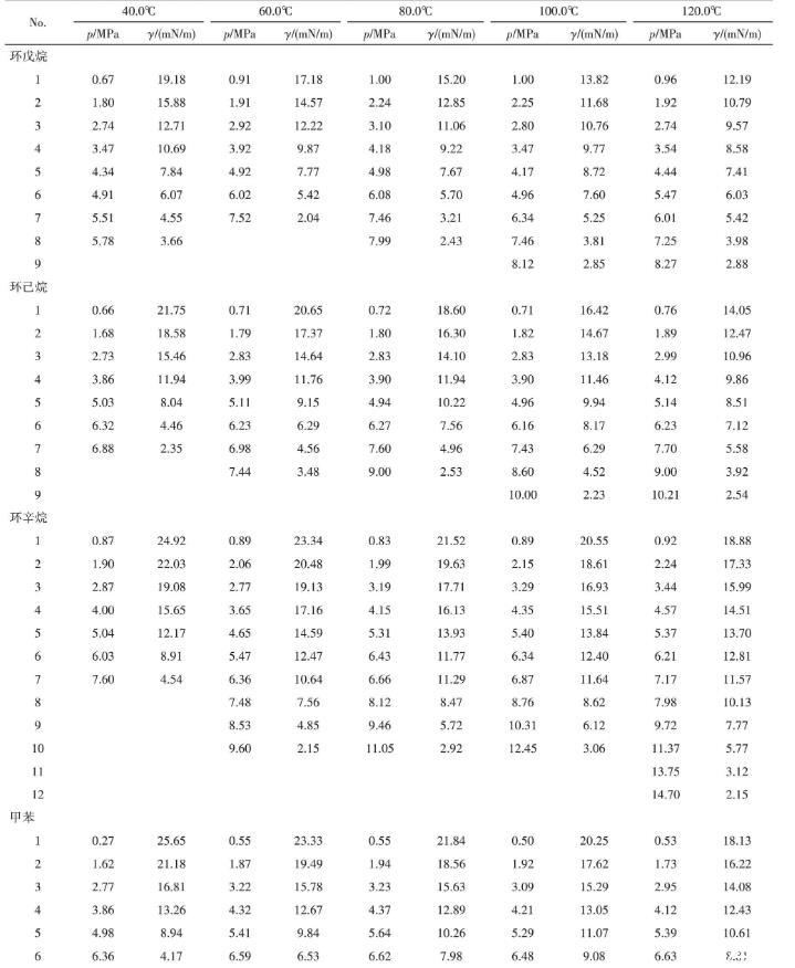 (5)對實驗所測以及文獻的數(shù)據(jù)進行了關(guān)聯(lián),其平均相對偏差為11.01%。結(jié)果表明,此經(jīng)驗方程可較好地用于CO2-正構(gòu)烷烴/環(huán)烷烴/芳香烴體系界面張力的計算。且與狀態(tài)方程結(jié)合密度梯度理論相比,無需相平衡數(shù)據(jù)及影響因子參數(shù),應用更為簡便。可為今后計算多元組分界面張力提供支持。