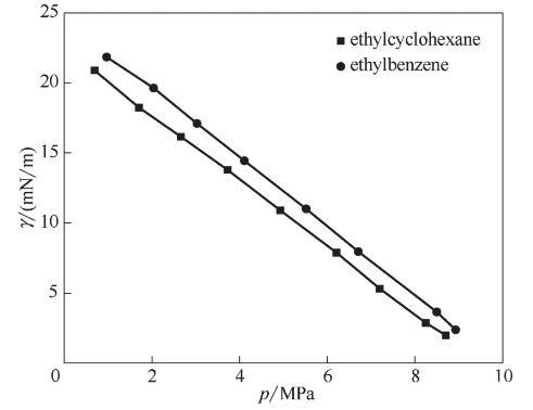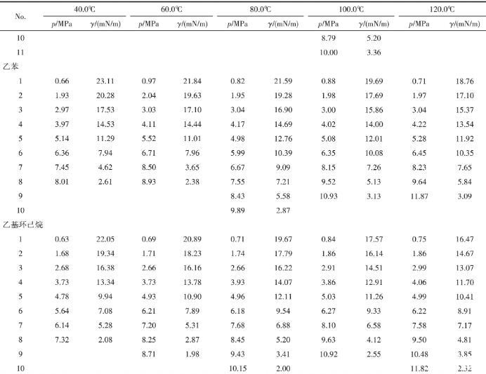 為探究相同碳原子數(shù)、不同結(jié)構(gòu)的影響,選取60℃下CO2-乙基環(huán)己烷/乙苯體系進行比較。由圖7可以看出,兩種體系的界面張力下降趨勢基本相同,但CO2-乙苯的界面張力略高于CO2-乙基環(huán)己烷體系。姬澤敏等、Nagarajan等曾對CO2-苯/環(huán)己烷體系的界面張力進行過測定,發(fā)現(xiàn)兩種體系界面張力隨壓力變化的等溫線幾乎重合,而CO2-乙基環(huán)己烷/乙苯體系界面張力差異明顯。從分子層面考慮,這是由于乙苯的極性比乙基環(huán)己烷大,從而導致乙苯分子間的相互作用更強,處于界面層的乙苯分子更難擴散到CO2中去,使得CO2-乙苯體系的界面張力大于CO2-乙基環(huán)己烷體系。