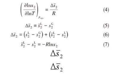 溫度對界面張力的影響比較復雜,首先溫度影響界面張力隨壓力的下降速度,隨著溫度的升高,界面張力下降速度越來越緩,使得不同等溫線在某個壓力范圍內(nèi)有交叉點;其次,不同區(qū)域內(nèi),溫度對界面張力的影響不同。在交叉點以上,界面張力隨溫度的升高而減小,而交叉點之下,界面張力隨溫度的升高而增大。為了分析溫度對CO2溶解度的影響,將Gibbs-Helmholtz方程計算的溶解度對溫度的導數(shù)與偏摩爾熵聯(lián)系起來,如式(4)~式(7)所示
