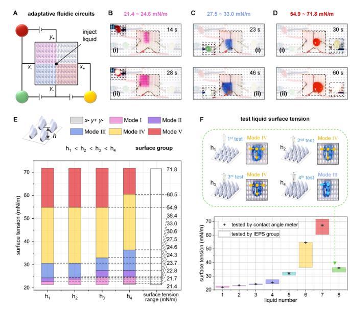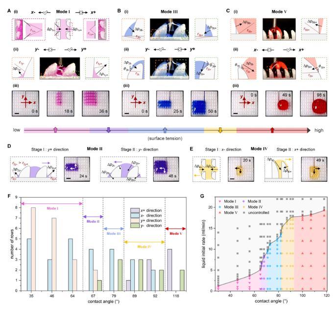 注入結構化表面的液體首先填充相鄰四個單元間的空隙,并在單元的特定曲率結構處形成局部曲率不等的液體彎月面,這導致液體表面不同位置的拉普拉斯壓差不同,進而驅動液體定向運輸。隨表面張力從低到高(22-72 mN/m),液體呈現(xiàn)出五種不同的運輸模式(I至Ⅴ)。研究人員利用水-乙醇溶液對這五種模式下液體沿x軸和y軸方向上的運輸行為進行力學分析(圖2)。表面張力較低的液體對界面的潤濕性較高,因此主要在單元底部曲率結構作用下,沿拉普拉斯壓差較低的方向運輸;而表面張力較高的液體會在結構化表面上積累,其運輸方向由單元頂部曲率調(diào)控。