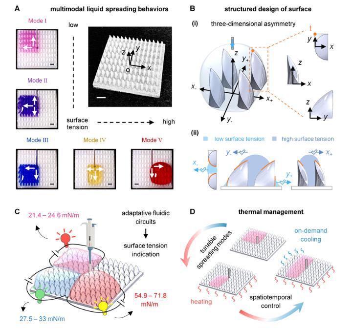 圖1:結構化表面上的多向液體運輸行為及潛在應用。
