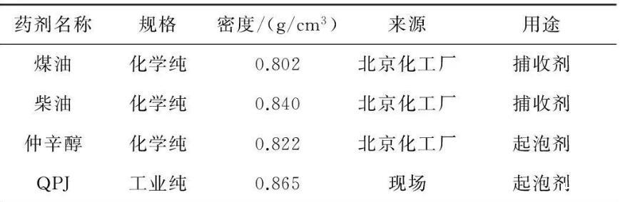 浮選藥劑有煤油、柴油、仲辛醇和QPJ,其基本性質及用途見表1。