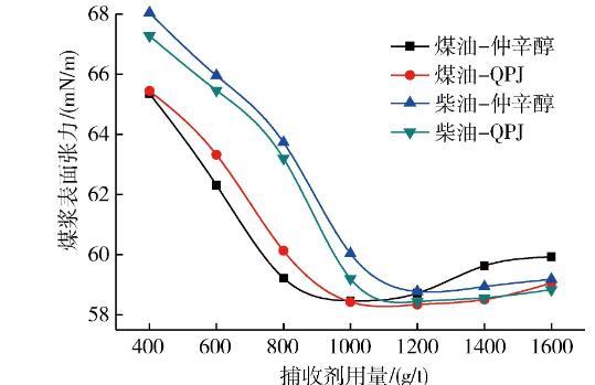 使用柴油做捕收劑時,煤漿表面張力在仲辛醇用量為160 g/t時達到最低值,在超過200 g/t后明顯回升;煤漿表面張力在QPJ用量達到160 g/t時達到最低值,在超過160 g/t后回升。由此可見,起泡劑對煤漿的表面張力有著較為顯著的影響。