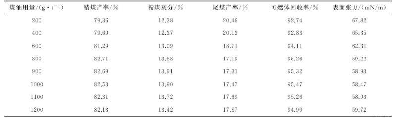 固定仲辛醇(起泡劑)用量為200 g/t,改變煤油(捕收劑)用量,同步進行浮選和表面張力試驗,結果見表2。