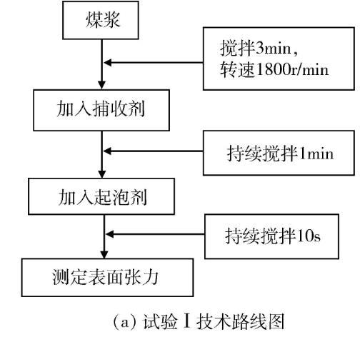試驗分為試驗Ⅰ和試驗Ⅱ兩部分。在試驗Ⅰ中,先后改變捕收劑和起泡劑用量,對添加浮選藥劑后煤漿的表面張力進行測定,以研究浮選藥劑用量對煤漿表面張力影響的規律。在試驗Ⅱ中選用煤油/仲辛醇做捕收劑/起泡劑,先后改變煤油和仲辛醇的用量,按照《GB/T 4757-2013煤粉(泥)實驗室單元浮選試驗方法》對馬蘭2#煤泥進行浮選試驗,并在浮選充氣前對煤漿同步進行表面張力的測定,進一步對浮選過程中浮選藥劑量、煤漿表面張力及浮選效果之間的關系進行探索。試驗控制煤漿濃度為100 g/L,溫度為22±0.2℃;使用一次去離子水(pH值為7.0±0.2)。試驗技術路線見圖1。