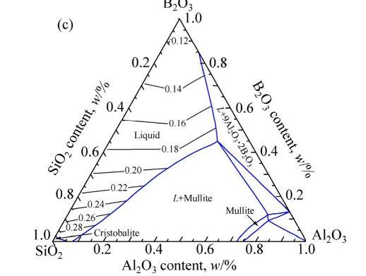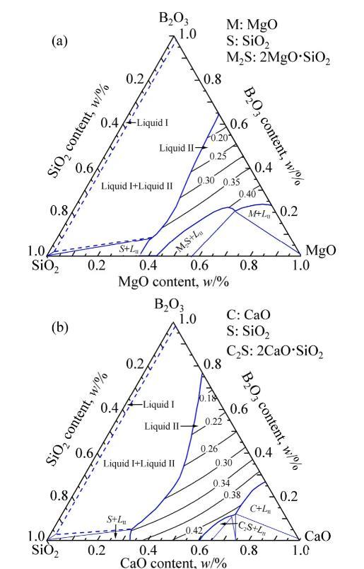 1873K時含B2O3三元體系等溫相圖及液相線如圖4所示。實際條件下,Si常存在于金屬相中,而SiO2則以硼硅酸鹽的形式存在于熔渣中,因此,SiO2添加對含B2O3三元體系熱力學性質的影響仍有待確定,MgO-B2O3-SiO2、CaO-B2O3-SiO2和Al2O3-B2O3-SiO2三元系相圖也需要進一步優化。1873K時含B2O3三元體系熔渣等表面張力線如圖4所示。結果表明,在MgO-B2O3-SiO2體系和CaO-B2O3-SiO2體系1873K完全液相區(Liquid II)范圍內,熔渣表面張力值在0.15~0.45 N/m范圍內;隨著B2O3含量的增加,表面張力顯著降低;隨著SiO2含量、MgO含量和CaO含量的增加,熔渣表面張力逐漸增大,但MgO含量和CaO含量對表面張力的影響更加顯著。在Al2O3-B2O3-SiO2體系1873K完全液相區(Liquid)范圍內,熔渣表面張力在0.10~0.30 N/m范圍內;熔渣表面張力隨B2O3含量的增加而逐漸減小,隨SiO2含量和Al2O3含量的增加而逐漸增大。
