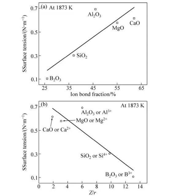 純氧化物表面張力主要與離子間的鍵能有關,形成氧化物的離子的靜電勢(Z/r)大,且離子鍵分數高的氧化物有較大的表面張力。純組分氧化物的靜電勢和離子鍵分數如圖3所示。純液態B2O3屬于表面活性物質,在1873 K時的表面張力約為0.104 N/m,僅為MgO、CaO、Al2O3和SiO2同溫度純物質表面張力數據的1/6~1/3。Si4+和B3+離子雖然靜電勢很高,但其離子鍵分數較低(<50%),易形成共價鍵高、靜電勢小的絡離子,從而其表面張力值較小;Mg2+、Ca2+和Al3+離子雖然靜電勢較小,但離子鍵分數較高,從而具有較高的表面張力值。