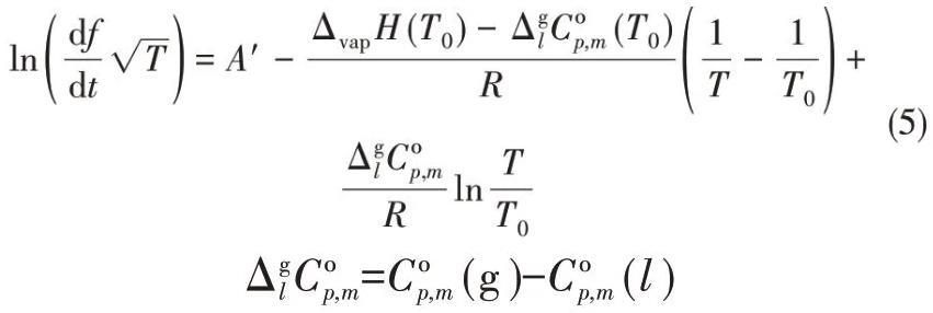 Verevkin等[54]開發(fā)了評估程序的物理基礎(chǔ),并使用1-乙基-3-甲基咪唑雙(三氟甲磺酰基)酰亞胺[C2mim][Tf2N]進行測量,從而將蒸發(fā)焓的測量范圍降低到363 K。和文獻中已有的數(shù)據(jù)相比較,具有一致性。這項工作中開發(fā)的方法也為得到ILs的汽化焓開辟了一條新途徑。經(jīng)過一系列公式推導(dǎo),構(gòu)建了ILs的摩爾汽化焓、頻率損耗率df/dt和溫度的關(guān)系