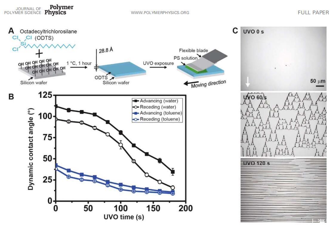 圖 1 (A) 制備具有可調表面能的基材然后應用流涂工藝的示意圖。 (B) 動態 接觸角包括作為 UVO 時間函數的基材的前進(實心數據點)和后退(開放數據點)。 使用水(黑色數據點)和甲苯(藍色數據點)的液體。 誤差棒表示三個的標準偏差 獨立樣本。 (C) 在具有可調表面能的基材上制造的結構,從無沉積、超支化結構到通過流涂的水平線。 此處使用的其他流涂參數是初始濃度 co,如 0.5 mg/mL,停止時間 t 為 100 ms,設置距離 d 為 5 lm。