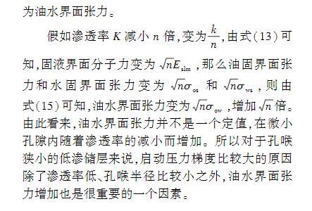 式(15)可知,油水界面張力變?yōu)閚σow,增加n倍。由此看來,油水界面張力并不是一個定值,在微小孔隙內(nèi)隨著滲透率的減小而增加。所以對于孔喉狹小的低滲儲層來說,啟動壓力梯度比較大的原因除了滲透率低、孔喉半徑比較小之外,油水界面張力增加也是很重要的一個因素。