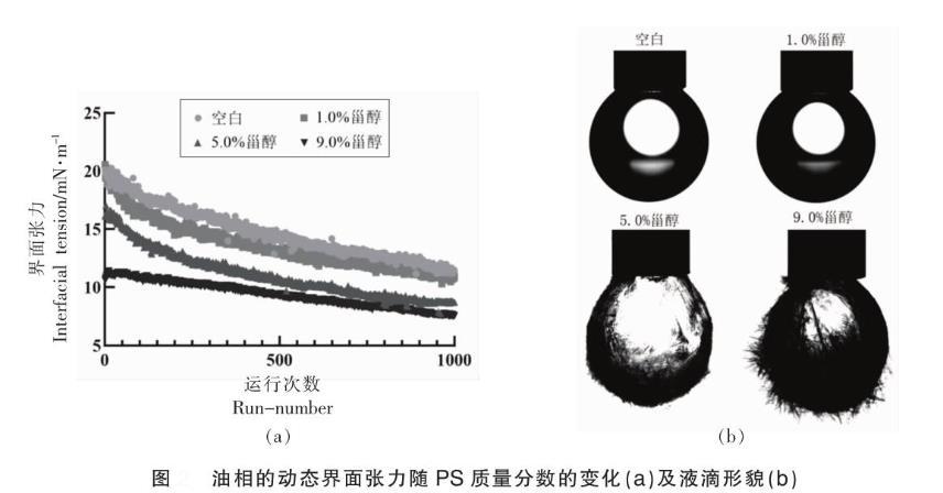 首先,將連接在毛細(xì)管上的不銹鋼針(外徑為1.65mm)插人盛有油相的玻璃槽內(nèi)。將針尖端放置在光源和相機(jī)(CCD)之間的光學(xué)平板上。然后用自動(dòng)進(jìn)樣單元將10μL的樣品推送至針尖上并形成完整的滴形。CCD攝像系統(tǒng)立即持續(xù)地采集液滴的外形輪廓變化,測(cè)試時(shí)維持油相溫度60℃,盡量避免外界振動(dòng)的干擾。據(jù)Young-Laplace方程算出界面張力(精確至0.01mN/m)。