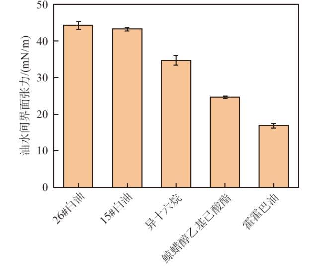 油水間的界面張力(γ0)可以用來表征油和水分子之間的內(nèi)聚性或混溶性,被證實(shí)是表征油相極性的可靠指標(biāo)。隨著油水間的界面張力減小,油相的極性增大。如圖1所示,油水間界面張力為26#白油(44.3±1.1),15#白油(43.3±0.5),異十六烷(34.8±1.3),鯨蠟醇乙基己酸酯(24.6±0.4),霍霍巴油(16.9±0.6)。因此,不同油脂的極性大小順序?yàn)椋夯艋舭陀?gt;鯨蠟醇乙基己酸酯>異十六烷>15#白油>26#白油。查閱相關(guān)文獻(xiàn)可知,霍霍巴油和鯨蠟醇乙基己酸酯為極性油脂,而26#白油、15#白油和異十六烷為非極性油脂。