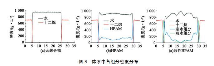 聚合物改變油水界面張力的本質是油水界面特征的改變,為此分析各個組分在體系中的密度分布情況,結果見圖3。可以看出,在沒有聚合物的情況下,油水界面非常清晰,油相和水相處于完全分離的狀態。加入HPAM后,油相的分布幾乎沒有變化,而界面處水相密度變化的斜率略有減少,說明HPAM主要分布在水相中,在一定程度上減少了界面上水分子的數量。但由于HPAM和油相之間的相互作用較弱,因此并沒有改變油相在界面附近的分布情況。改性HPAM的加入對油水兩相的密度分布影響都較大,界面處油相密度變化的斜率減小,說明親油組分和油分子相互融合,從密度分布還可以看出由于聚合物的加入,油相和水相被聚合物顯著分離。