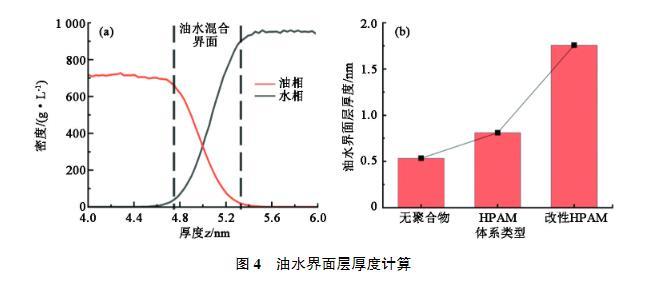 界面層厚度能夠反映油水界面處兩相的混合情況,一般來說界面厚度越大說明兩相之間的排斥越小,互溶效果越好,界面張力越低。參考Ricardo Paredes等的方法,選取密度低于油和水密度峰值90%的區域作為油水混合界面,如圖4(a)所示。計算得到的界面層厚度見圖4(b)。可以發現,加入HPAM對于界面層影響很小,改性HPAM的加入可以大幅提高油水界面層厚度。這也反映出未改性HPAM油水界面依然比較清晰,兩相界限明顯,界面處油分子和水分子受力不均勻的現象依然嚴重;改性HPAM疏水基團進入油相中,引起z方向油水分布重疊區域變大,油水界面區域擴展,油水界面變得凹凸不平,油水相的“螯合”加強,界面處分子受力不均衡得到了緩解,有利于界面張力降低。