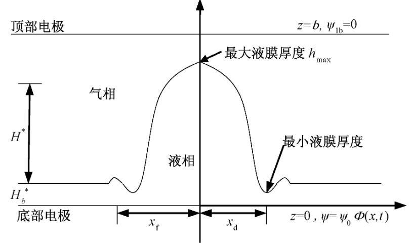 上述研究表明,電場強度對表面張力的影響大致分為表面張力隨電場強度提高而減小、增大和不變等三種情形。而目前對于受電場作用時的液滴運動的理論研究中,均假設表面張力不受電場影響,即表面張力不變,進而模擬其運動特征;這顯然與上述多數實驗所得結論明顯不符,也不能準確反映電場對液滴運動的影響。為此,本文基于實驗研究結果,建立表面張力與電場強度間的關系式,推導電場作用下描述液滴運動過程的演化方程,采用數值模擬獲得不同電場情形下的液滴運動行為,進而分析因電場作用帶來的表面張力變化對液滴運動特征的影響。