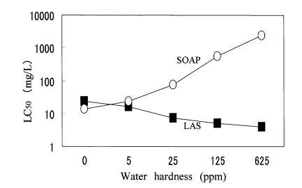 在預(yù)測(cè)試中,大型水蚤在 4 鹽混合中存活 溶液,但不能在 CaCl2?H2O 溶液中存活,也不能 蒸餾水。 另一方面,羅漢松在所有 3 種水中都能存活。 因此,羅漢果被用來 檢查水硬度成分對(duì) LAS 和 SOAP 的毒性。 如圖 3 所示,CaCl2?H2O 之間沒有觀察到毒性值的差異 溶液和四鹽混合溶液。 肥皂的毒性 隨著水硬度的增加而降低,和 LAS的毒性隨著水硬度的增加而增加。
