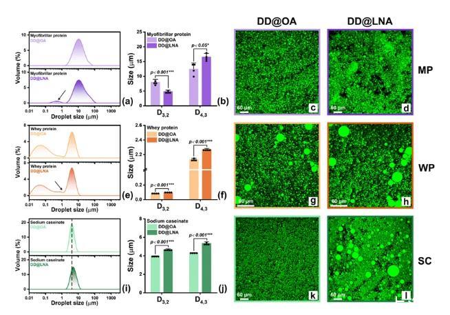 圖7.乳液的形成特性:(a)MP,(e)WP和(i)SC乳液的粒徑分布;(b)MP,(f)WP和(j)SC乳液的D3,2與D4,3;(c-d)MP,(g-h)WP和(k-l)SC乳液的激光共聚焦圖像。*p<0.05,**p<0.01,***p<0.001