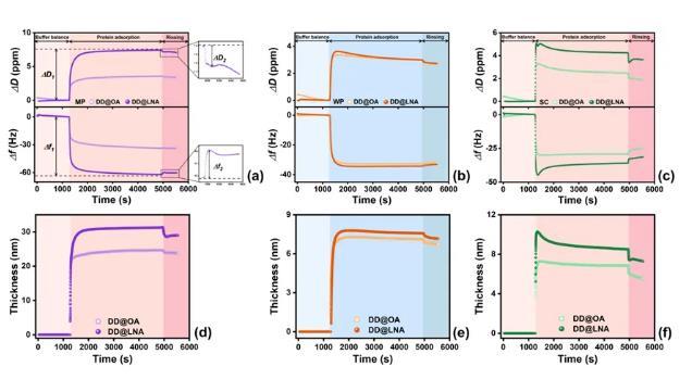 圖6.QCM-D試驗(yàn):(a)MP,(b)WP和(c)SC在不同飽和度界面上吸附時(shí)的共振頻率遷移(Δf)與能量耗散遷移(ΔD);(d)MP,(e)WP和(f)SC在不同飽和度界面上形成的吸附層厚度