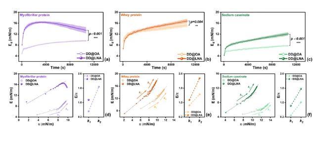 圖4.線性粘彈區(qū)域內(nèi)(振幅10%),不同飽和度界面上(a)MP,(b)WP和(c)SC界面膜的彈性模量;(d)MP,(e)WP和(f)SC界面膜的膨脹模量-界面壓力關(guān)系圖。*p<0.05,**p<0.01,***p<0.001