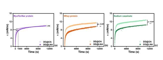 圖2.(a)MP,(b)WP和(c)SC在不同飽和度界面上吸附時(shí)的界面壓力。*p<0.05,**p<0.01,***p<0.001,ns無(wú)顯著差異