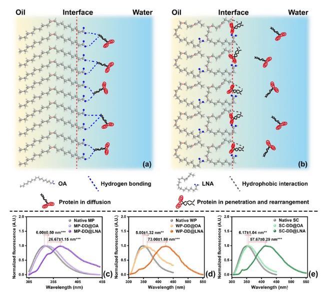 圖3.(a-b)油脂不飽和度影響蛋白質(zhì)界面吸附動(dòng)力學(xué)的機(jī)制示意圖;界面(c)MP,(d)WP和(e)SC的歸一化前表面熒光光譜。*p<0.05,**p<0.01,***p<0.001