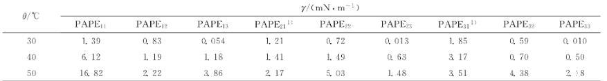 表2不同溫度下9種PAPEmn溶液-孤東二元驅(qū)原油體系的油-水界面張力的穩(wěn)態(tài)值(γ)