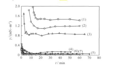 表4加入酚胺樹脂聚醚破乳劑的不同原油體系的穩(wěn)態(tài)油-水界面張力(γ)