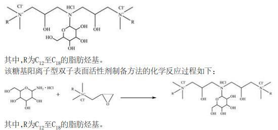 將所需量的2,3-環(huán)氧丙基-N,N-二甲基烷基氯化銨和氨基葡萄糖鹽酸鹽溶于水中,反應(yīng)后,得到糖基陽(yáng)離子型雙子表面活性劑的水溶液,其中,2,3-環(huán)氧丙基-N,N-二甲基烷基氯化銨與氨基葡萄糖鹽酸鹽的摩爾比為2至2.2:1,2,3-環(huán)氧丙基-N,N-二甲基烷基氯化銨與氨基葡萄糖鹽酸鹽的總質(zhì)量與水的質(zhì)量比為1:9。