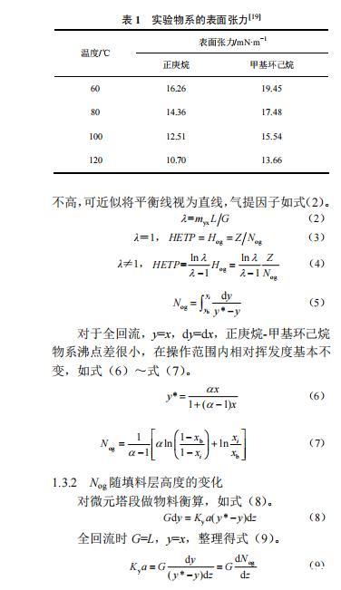 規整填料塔中,影響傳質性能的因素很多,Zuiderweg等認為表面張力對傳質的影響顯著大于密度、黏度、擴散系數等其他物性。之后很多學者研究了表面張力梯度引起的Marangoni效應對精餾傳質的影響,研究物系大多集中在能形成較大表面張力梯度的有機物水溶液。由于表面張力與其他物性密切相關,且表面張力對傳質過程的影響機理相當復雜,至今沒有一個滿意的結論。近年來,精餾領域的傳質過程研究主要集中在過程模擬,國內外對新型高比表面積規整填料的傳質過程的實驗研究還不多,有關工業尺寸的規整填料塔則更少涉及。