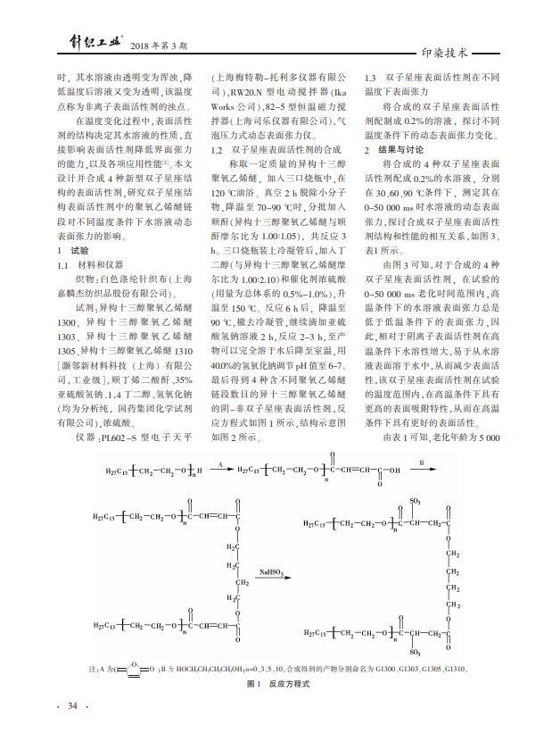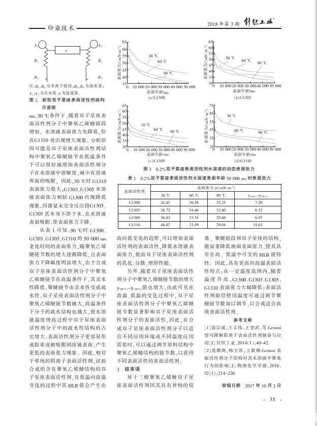 以異構(gòu)十三醇聚氧乙烯醚、順酐、丁二醇和亞硫酸氫鈉為原料合成4種陰-非離子雙子星座表面活性劑,并探究其水溶液的動(dòng)態(tài)表面張力隨溫度的變化特性。結(jié)果表明,異十三醇聚氧乙烯醚雙子星座表面活性劑因其具有異構(gòu)的烷基、聚醚鏈段和雙子星座的結(jié)構(gòu),能顯著降低水溶液的表面張力,使其具有在高、低溫中可變的HLB值特性,具有更高的高溫表面活性;隨著溫度的升高,G1300、G1303、G1305、G1310的表面張力都有較大程度降低;表面活性劑使用的最佳溫度,可以通過調(diào)節(jié)聚醚鏈節(jié)數(shù)加以調(diào)節(jié)。