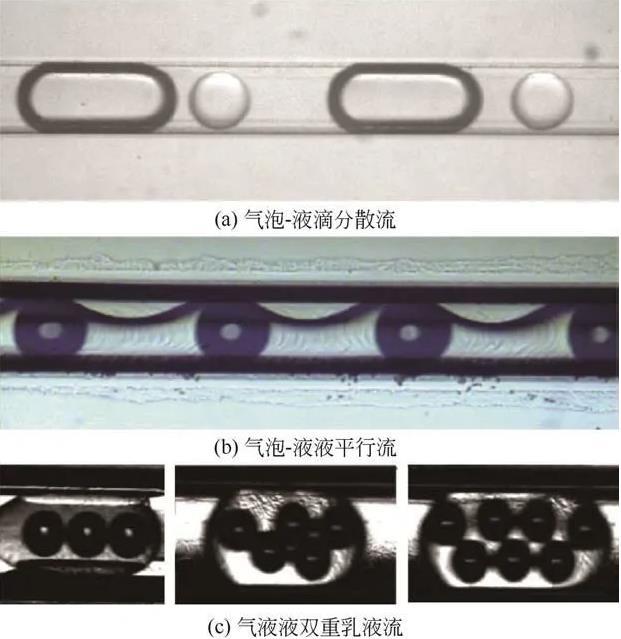 上述不同類型的微通道中所形成的流型也是學者們重點關注的內容。在材料制備領域,流型是決定合成材料結構的關鍵因素且直接影響著材料的相關性能;在過程強化領域,不同流型的強化效果差別較大,選擇并調控合適的流型是重中之重;在三相反應中,流型可決定反應的轉化率和選擇性,是需要優化的重要參數之一。相比于兩相體系,三相體系由于流體間更為復雜的相互作用及更高的自由度而呈現出了更多的流動形態(圖3)。如Su等在十字形微通道中成功調控出液滴氣泡間隔排列的氣液液三相流。Xu等基于同軸環管微設備實現了氣液液雙乳液的可控制備,并揭示了流量和界面張力等因素對雙乳液結構的影響。Wang等在雙T形通道內通過調節操作條件可控制備了“水包油包氣”和“含有氣泡的液液平行流”兩種結構。Rajesh等通過觀察液滴氣泡的形狀及位置關系定義了“氣柱-液柱”“彈狀-液滴”“液柱-雙氣彈”等流型。除了實驗手段Rajesh等借助VOF數值模擬方式從機理上揭示了氣液液三相流的流動規律,歸納了不同Ca和We范圍內的流型特征和規律。此外,Yang等通過傳質引發相分離的方法成功調控出氣液液雙乳液,該方法能實現更大范圍內氣泡直徑尺寸和液膜厚度的調節。