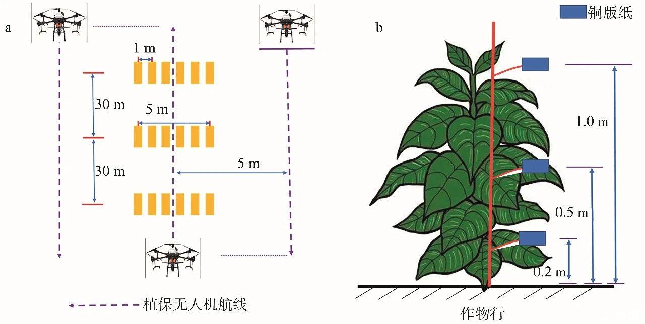 試驗(yàn)時(shí)無人機(jī)采用常規(guī)往復(fù)施藥模式進(jìn)行噴霧作業(yè),各條航線之間間隔為5.0 m,試驗(yàn)地塊開闊無遮擋,且煙草長勢較為一致。試驗(yàn)前,在各處理小區(qū)中間地帶布置3排間隔為30.0 m的霧滴采集帶,每條霧滴采集帶含6個霧滴采集點(diǎn),每個采集點(diǎn)間隔1.0 m,總長度5.0 m(圖1a)。每個霧滴采集點(diǎn)處插一根采樣桿,用雙頭夾將銅版紙固定在采樣桿上。設(shè)置上、中、下3層采樣位置,分別距地面1.0、0.5和0.2 m(圖1b)。用于測定煙草上、中、下冠層的霧滴密度和覆蓋率。噴霧結(jié)束后,待銅版紙上的霧滴自然晾干后收取并裝入自封袋帶回實(shí)驗(yàn)室。