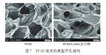 根據(jù)TPAE/無(wú)機(jī)粒子復(fù)合物泡沫的泡孔結(jié)構(gòu)圖可以看出,相比較于純TPAE泡沫的閉孔結(jié)構(gòu),無(wú)機(jī)粒子的添加明顯促進(jìn)了TPAE泡沫泡孔的打開(kāi)。為詳細(xì)探究無(wú)機(jī)粒子的開(kāi)孔機(jī)制,使用真密度儀對(duì)不同TPAE/無(wú)機(jī)粒子復(fù)合物泡沫的開(kāi)孔率進(jìn)行了測(cè)試,如圖6所示。無(wú)機(jī)粒子的添加都提高了TPAE泡沫的開(kāi)孔率,表明無(wú)機(jī)粒子的加入是影響開(kāi)孔率的關(guān)鍵因素。基于TPAE和TPAE/CaSiO3復(fù)合物泡沫中的開(kāi)孔結(jié)構(gòu)分析無(wú)機(jī)粒子對(duì)復(fù)合物泡沫開(kāi)孔結(jié)構(gòu)的影響(以CaSiO3為例),如圖7所示。可以看出,純TPAE泡沫主要出現(xiàn)泡孔壁上,且形成的孔比較規(guī)則,這是由于純TPAE熔體強(qiáng)度低,泡孔壁容易破裂。而TPAE/CaSiO3復(fù)合物泡沫的開(kāi)孔主要發(fā)生在泡孔的內(nèi)壁以及幾個(gè)泡孔的相交處上,這是因?yàn)樵谂菘咨L(zhǎng)過(guò)程中,由于CaSiO3的非均相成核,泡孔在CaSiO3分散相周圍成核生長(zhǎng),形成花狀的泡孔結(jié)構(gòu),而TPAE與無(wú)機(jī)粒子的相容性差,使得CaSiO3從泡孔壁上脫落,留下不規(guī)則的網(wǎng)狀結(jié)構(gòu),從而導(dǎo)致泡孔間相互連接。其他3種TPAE/無(wú)機(jī)粒子復(fù)合物泡沫的開(kāi)孔形式同TPAE/CaSiO3復(fù)合物泡沫一致。圖8展示了兩種與TPAE具有不同界面張力的粒子(以CaSiO3和Talc為例)的添加對(duì)復(fù)合物泡沫開(kāi)孔結(jié)構(gòu)形成的影響機(jī)制。