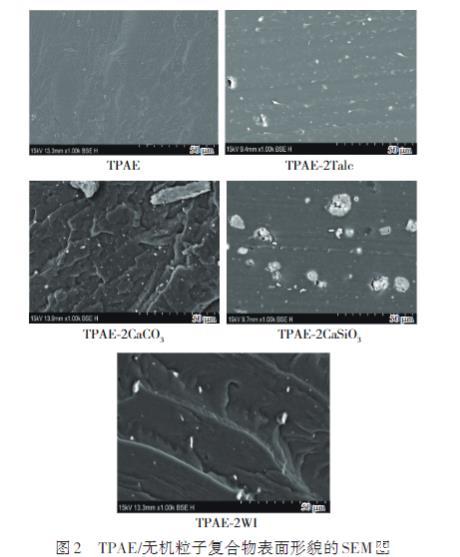 對(duì)比之下,含有CaSiO3、CaCO3、WI無(wú)機(jī)粒子的TPAE復(fù)合材料展示出典型的兩相形態(tài),這些粒子在TPAE基體中的均勻分散揭示了TPAE與這3種無(wú)機(jī)粒子之間在熱力學(xué)上的不相容性。值得注意的是,相比較于TPAE-2CaCO3和TPAE-2WI,TPAE-2CaSiO3復(fù)合材料的斷面形貌中的CaSiO3粒子表現(xiàn)出明顯的團(tuán)聚現(xiàn)象,這可歸因于CaSiO3獨(dú)特的多孔蜂窩狀結(jié)構(gòu),使得在含量增加時(shí),粒子間相互碰撞并傾向于結(jié)合,容易形成更大的聚集體,使得CaSiO3粒子尺寸顯著大于其他兩種無(wú)機(jī)粒子。